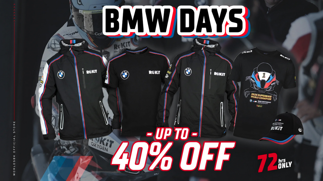 Peças selecionadas da coleção da equipa ROKiT BMW Motorrad WorldSBK estão com 40% de desconto até às 9h00 de quinta-feira, 12 de março de 2026. Isto inclui a coleção da própria equipa, nunca antes vendida.