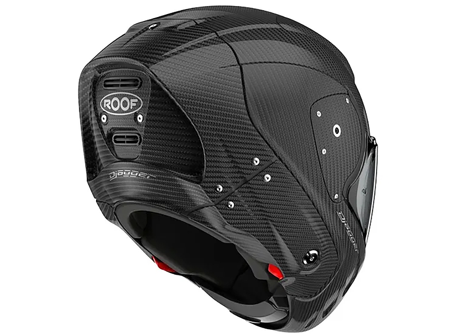 O mais recente capacete de moto da Roof abre pela parte traseira, permitindo assim que seja colocado na cabeça do motociclista.