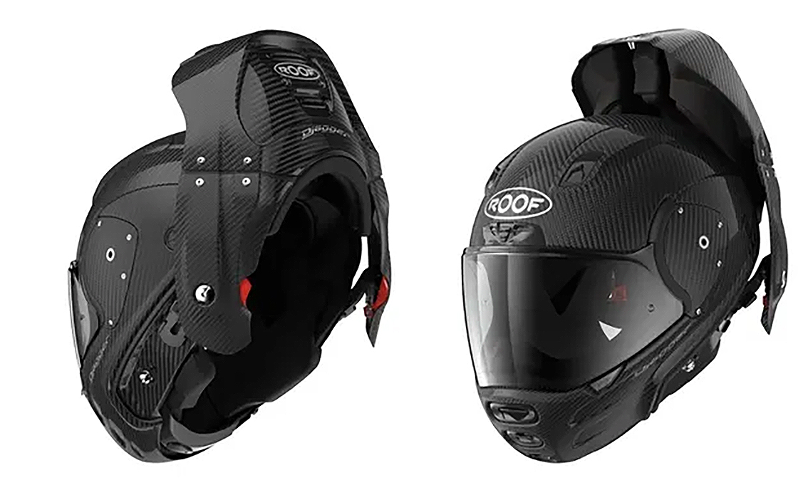 O mais recente capacete de moto da Roof abre pela parte traseira, permitindo assim que seja colocado na cabeça do motociclista.