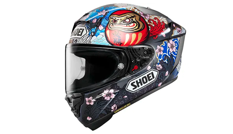 E o capacete que ele usou, cheio de complexos e coloridos motivos da cultura japonesa, e um bocadinho de humor à mistura, está agora disponível, já que a Shoei rapidamente desenvolveu o seu topo de gama X-SPR Pro naquele esquema de cores único e intrincado.