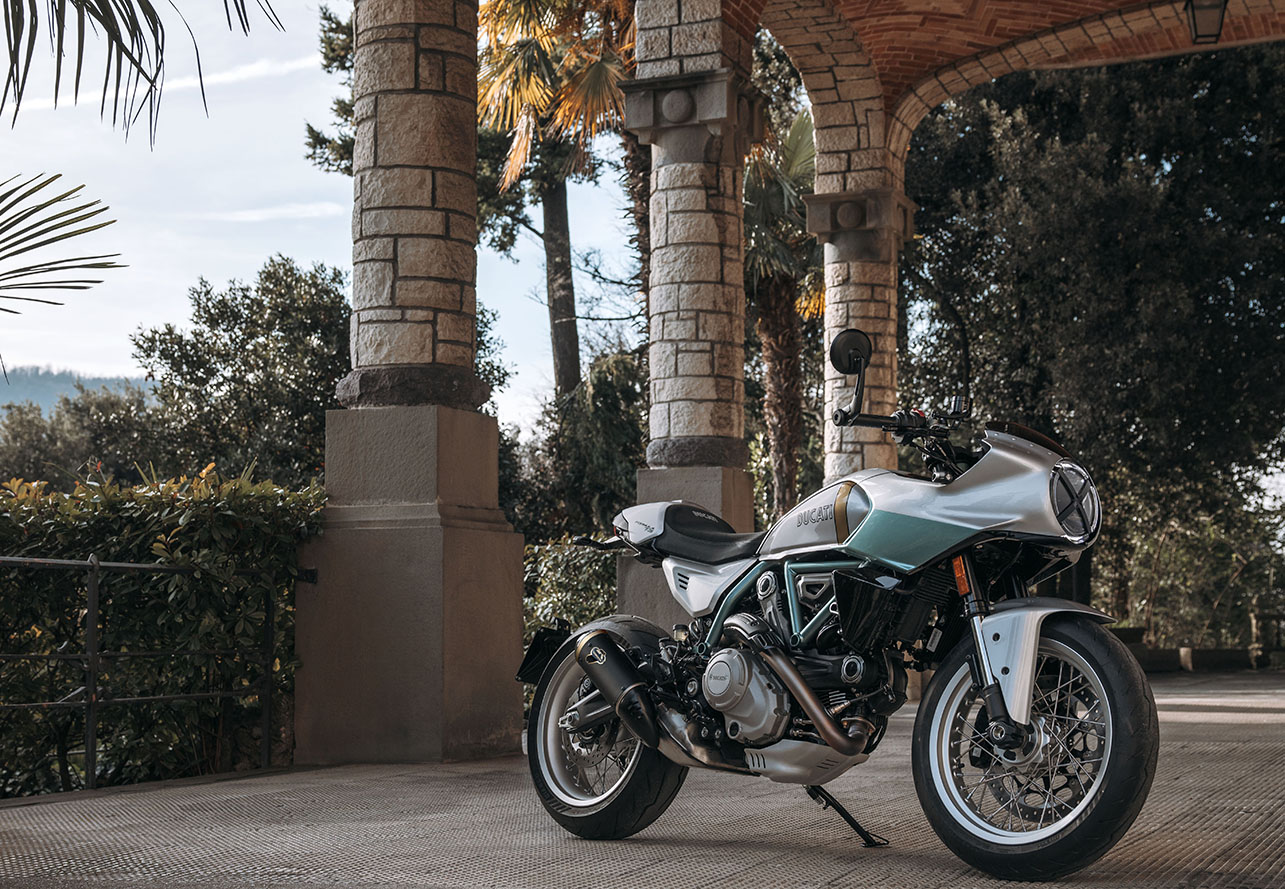 O guiador clip-on com espelhos retrovisores nas extremidades, a carenagem curta e afilada e a traseira confirmam a personalidade Café Racer desta moto de coleção. Os diversos componentes em alumínio maquinado, como as manetes de travão e embraiagem com reservatórios de óleo, os pedais e a tampa de combustível Rizoma fornecida de série, chamam a atenção e valorizam ainda mais uma moto concebida para ser admirada tanto parada como em andamento.