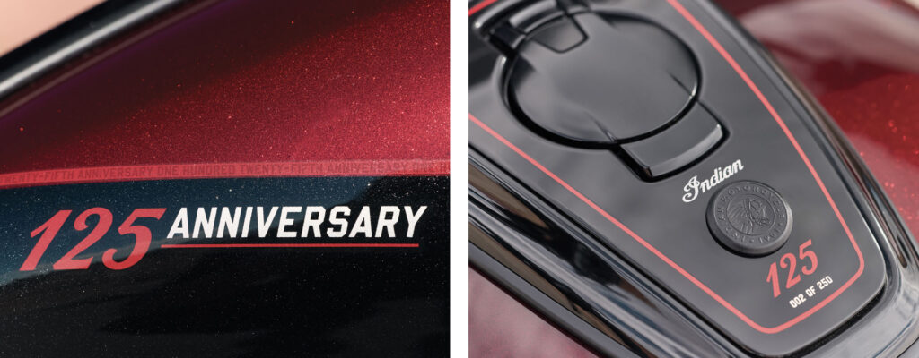 “Cada modelo… é meticulosamente pintado à mão, refletindo um nível excecional de artesanato e atenção aos detalhes”, afirma a Indian Motorcycle. “A pintura vermelha do 125º Aniversário com detalhes em Preto Cristal oferece uma estética única que celebra a rica história da Indian Motorcycle.