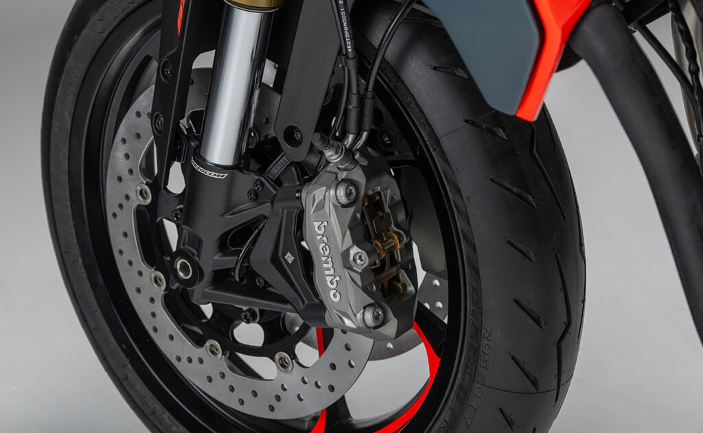 A roadster é travada por duas pinças Brembo de 4 pistões montadas radialmente e atuando em discos de 320 mm controlados por ABS. As jantes em liga de alumínio de 17” montam pneus radiais de 120/70 e 160/60.