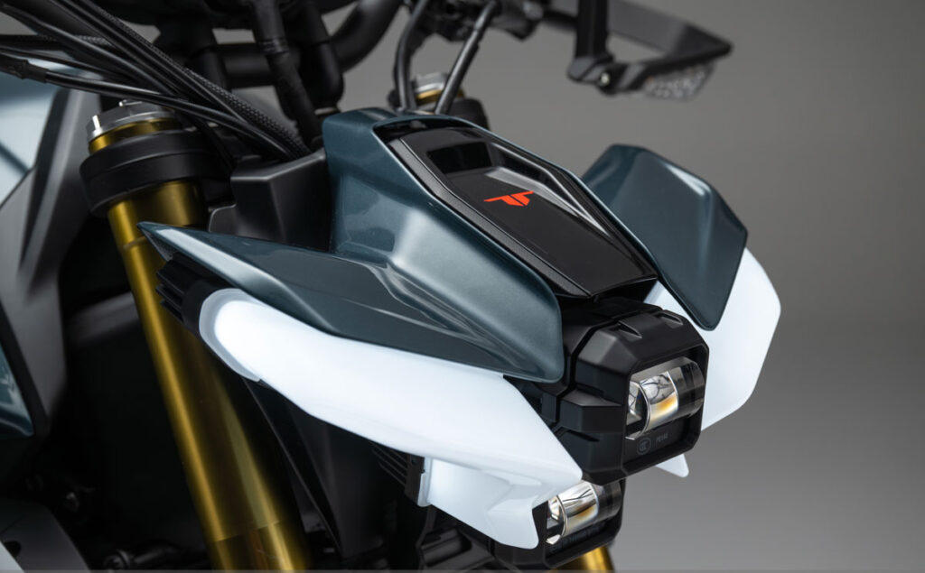 O farol está dividido em duas óticas, separados na base e na carenagem, com um par de luzes diurnas (DRL) em forma de T, destacando o logótipo do modelo. Os piscas são por sua vez deslocados para as finas proteções de mãos de cada lado.