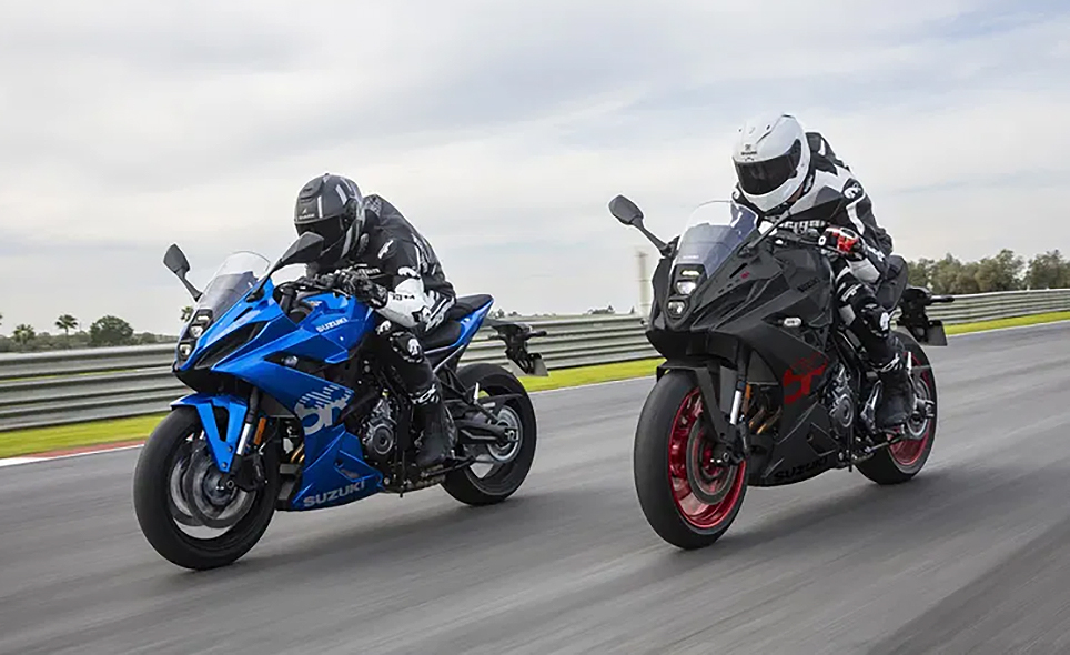 O primeiro modelo a receber uma ligeira atualização é a premiada desportiva GSX-8R, que foi apresentada no final de 2023. Como parte do novo visual, a GSX-8R está agora disponível em branco com jantes azuis. Há também uma nova variante em preto mate com jantes vermelhas, enquanto a tradicional cor Azul Metálico Triton se mantém, embora agora com jantes pretas em vez das cinzentas.