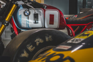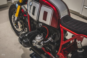Um farol Husqvarna 701 Enduro está na frente, instalado numa placa de identificação estilo pista feita à mão e complementado com uma faixa LED adicional. O depósito original da BMW R100 recebeu uma extravagante pintura personalizada que é de cortar a respiração, e estamos surpreendidos que o depósito ainda se destaque ao lado da bela estrutura vermelho-choque. Uma tampa de combustível BMW gravada acrescenta outro toque de modernidade ao depósito com 43 anos.