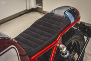 Um pouco mais atrás, um assento de camurça (estofado por um amigo) assenta sobre um sub-quadro personalizado. A carenagem traseira impressa em 3D pode ser habilmente removida para dar lugar a um passageiro. Um conjunto de apoios traseiros Tarozzi e pousa-pés novos foram instalados para melhorar a posição de condução.