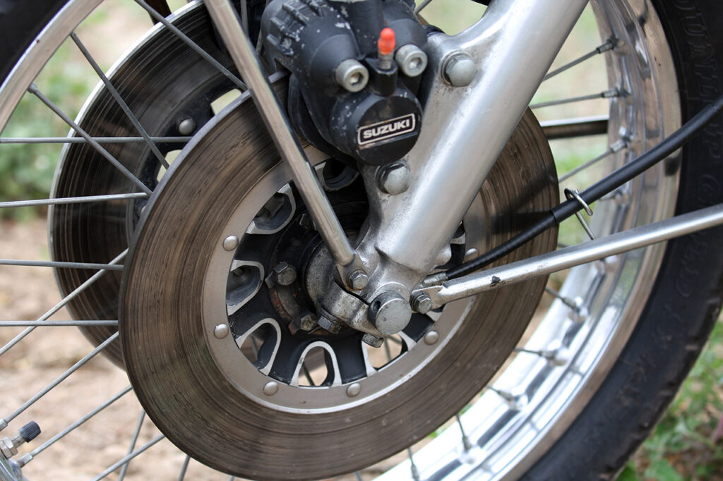 Só se começa a sentir o efeito quando a pressão da mão é muita e mantida por bastante tempo, e dizem que no molhado, com os rotores de inox sem perfurações, o cenário era ainda pior. De resto, é um facto que a moto se sente muito leve em condução, mostrando bem que, com 214 quilos, pesa bastante menos que os 235 Kg da Honda CB750 sua contemporânea, talvez graças à ausência de distribuição e afins facultada pelo seu motor a dois tempos…