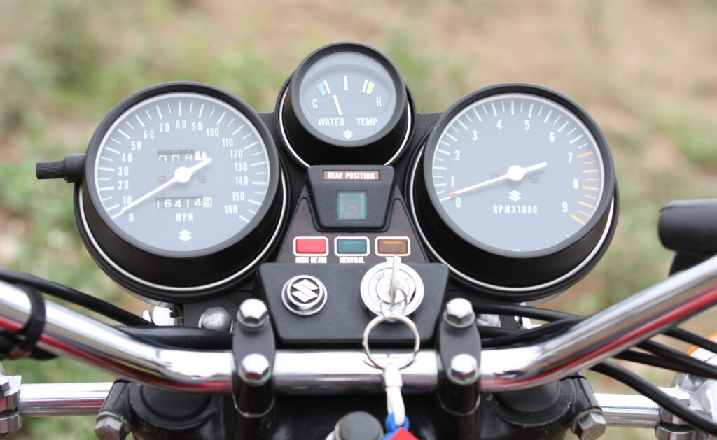 Um toque numa caixa que, pelos vistos, já nas Suzuki da época era de suavidade referencial, apaga a luz do neutro e acende entre os dois relógios analógicos o número da mudança selecionada no indicador digital de mudança, detalhe que muitos donos mais “barba rija” da época consideravam derisório, mas não deixa de ser um toque refinado.