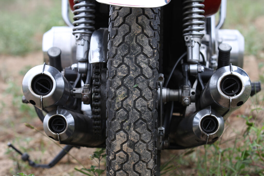 Uma embraiagem algo dura mas linear passa movimento às rodas, colocando-nos em movimento numa posição estranhamente elevada e muito ereta, graças aos guiadores largos, que em muitas unidades não tardariam a ser substituídas por avanços por donos mais determinados a explorar o lado desportivo da GT750. Não foi o caso nesta impecável modelo M de 1975, propriedade de Filipe Sousa do Porto, que até os punhos com borracha rendilhada e logo Suzuki mantém.