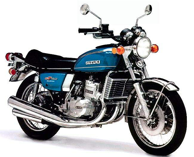 Apresentada em 1971 e lançada em 1972, a GT750 foi a última dois tempos de grande capacidade comercializada. O motor refrigerado a líquido granjeou-lhe a alcunha afetuosa de “kettle” (chaleira) em Inglaterra e Water Buffalo nos EUA, onde a designação do modelo era a Le Mans. Porta-estandarte da gama de três dois tempos que incluía a GT380 e GT550, a irmã maior tornou-se referencial em potência e funcionamento silencioso e suave. Não há nada equivalente nos nossos dias, sem dúvida uma das razões pela qual estas motos são tão apreciadas pelos colecionadores. 3 cilindros em linha, 738cc de capacidade, 3 carburadores CV, quatro escapes como era de rigor na época, e imensos cromados e tampas polidas. Em versão de corrida, a moto atingia quase os 290 Km/h em Daytona, granjeando legiões de fans ao modelo de estrada.