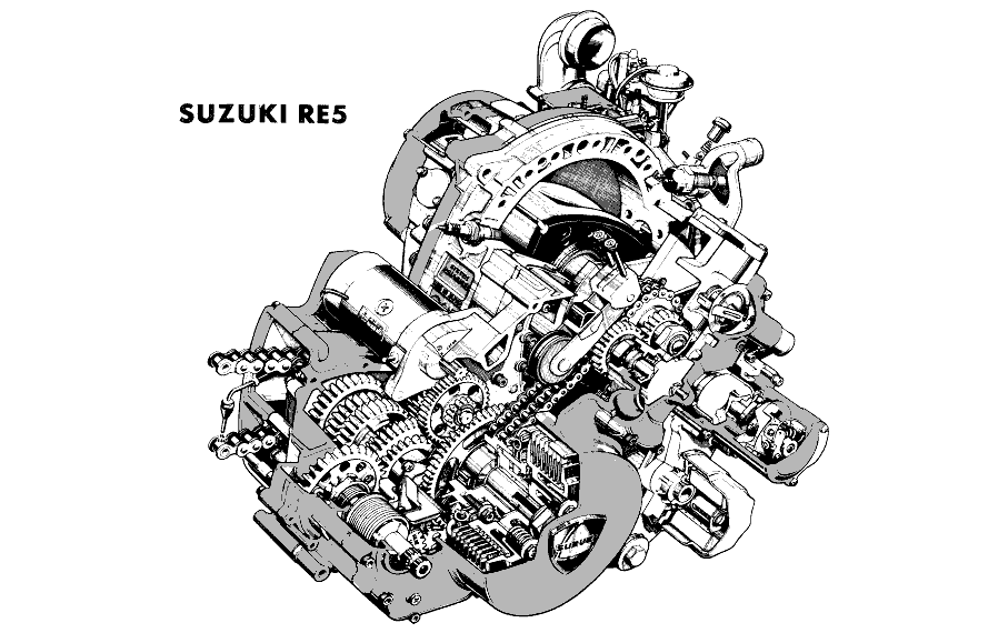 A Suzuki permanece a única, entre as marcas japonesas, a comercializar uma moto com motor rotativo, ou Wankel. Aconteceu em 1975 com a RE5. Apesar do falhanço comercial do projeto, o modelo, que hoje poucos conhecem, fica para a história como um dos mais arrojados dos finais do século XX