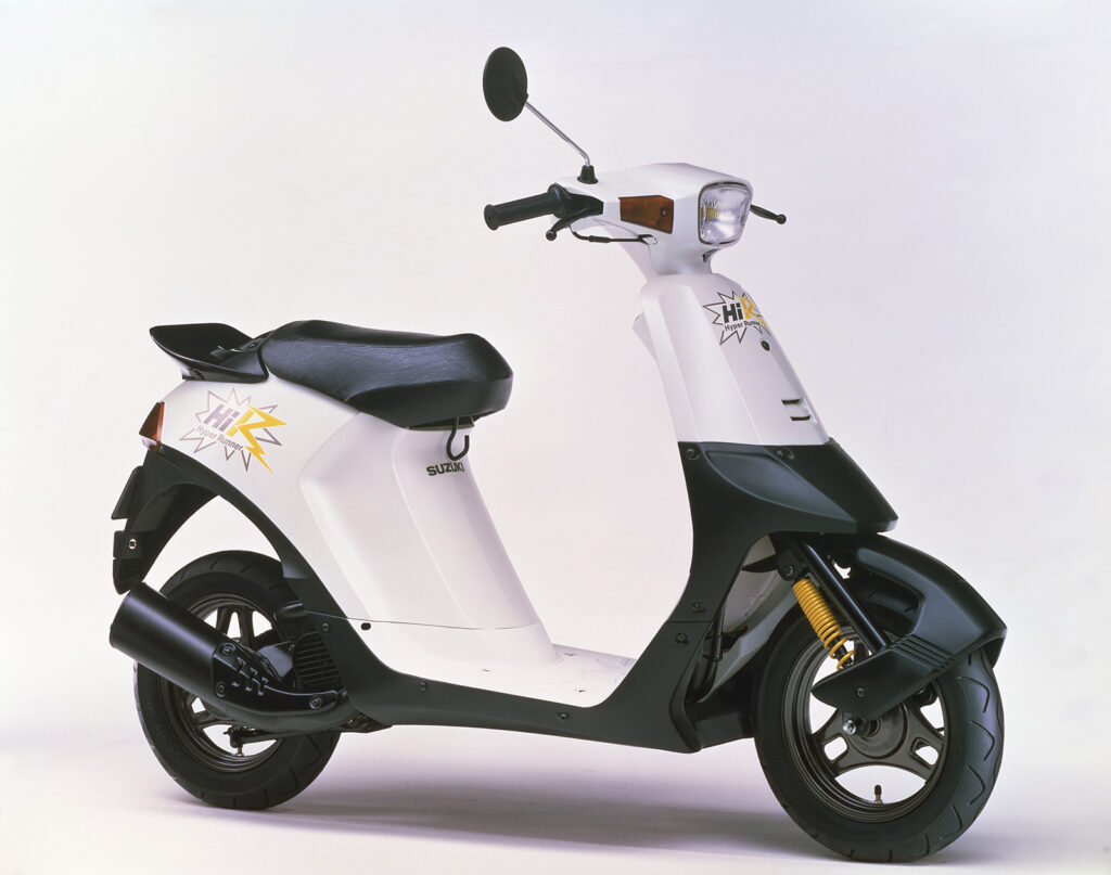 A combinação de um estilo arrojado e novas cores vibrantes na Suzuki Hi de 1985 resultou numa scooter excecional que agradava ao gosto moderno dos motociclistas mais jovens. Era um conceito de design bastante radical e único, chamado de “formato de anca alta” e consiste em linhas da carroçaria que se elevam do espaço para as pernas em direção à traseira. O mais parecido no nosso mercado era a Wolf, bem sucedida a dada altura.