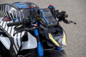 As marchas mudam com extrema precisão, enquanto a manete de travão Magura HC3 captura a energia libertada após a linha de chegada, desacelerando a moto até parar. Os apoios para os pés estendem-se muito além da parte traseira, proporcionando a Philipp o suporte necessário durante corridas de velocidade.