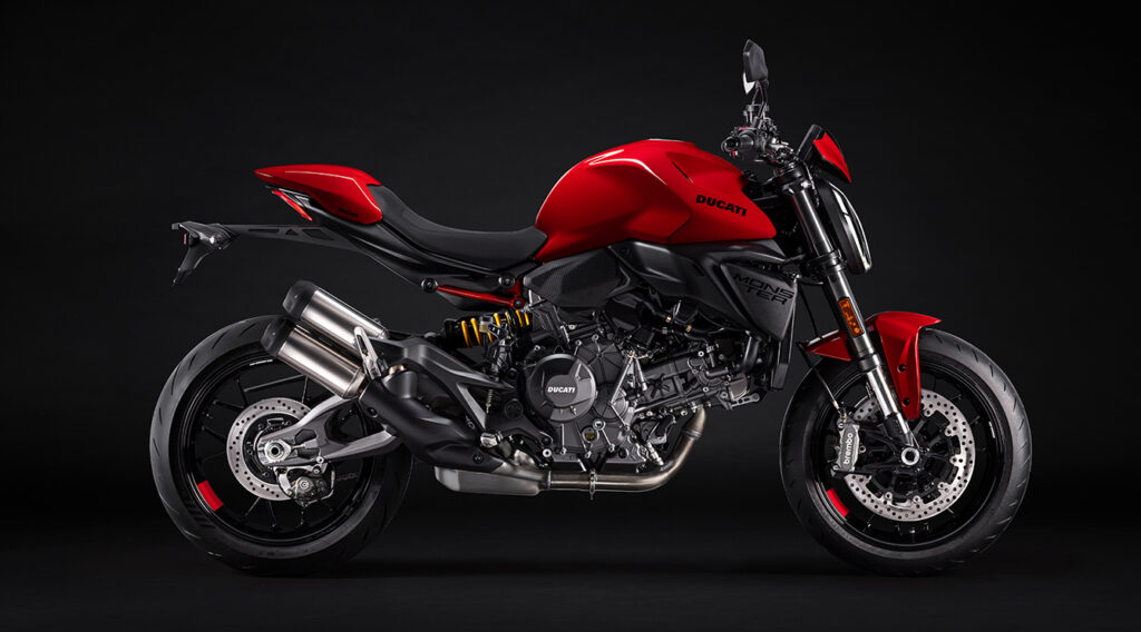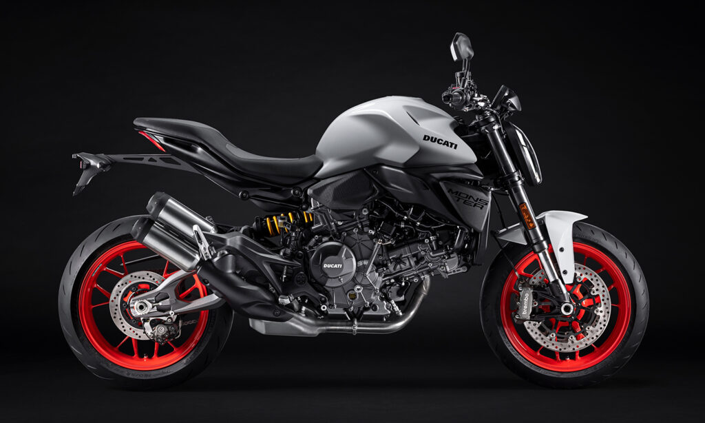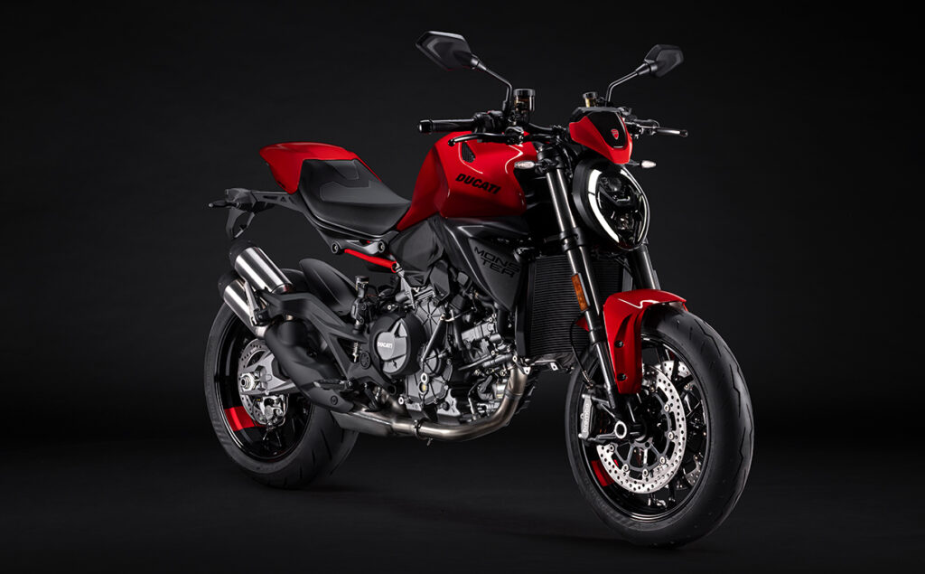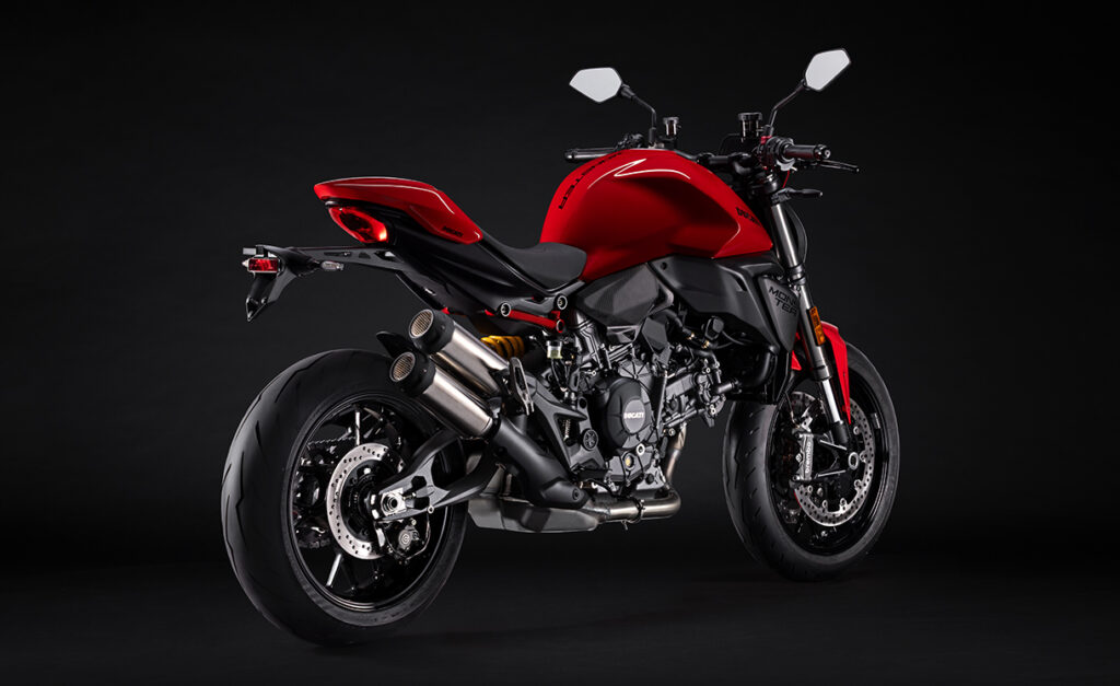 O novo Ducati V2 é uma parte da rigidez do chassis. Este último baseia-se num quadro monocoque, num duplo braço oscilante inspirado no braço oscilante oco da Ducati da Panigale V4 e num subquadro traseiro composto por um elemento tecno polímero e uma treliça. Esta solução técnica, combinada com o motor, contribui para tornar a nova Monster ainda mais leve do que o, já de si leve, modelo anterior (-4 kg, para um peso total de 175 kg com o depósito vazio) e, portanto, ágil e fácil de guiar em todas as situações.
