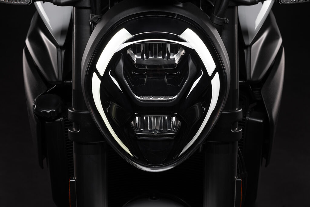 O farol, que no conjunto é o verdadeiro rosto da moto, é totalmente em LED, com um visual robótico e moderno que relembra vários elementos estilísticos da gama da Ducati. A forma de duplo ‘C’ é, de facto, a assinatura ótica que une as motos naked da Ducati, tornadas ainda mais distintivas nesta pelos dois ‘cortes’ laterais que lembram a frente da Panigale V4.