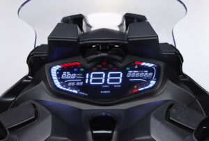 A posição de condução inclui um assento atualizado que proporciona uma posição mais relaxada e segura. O painel de instrumentos conta com um display LCD widescreen que exibe informações com clareza e é de fácil leitura. O sistema de iluminação é totalmente em LED, com faróis baixos e uma luz de posição superior que melhora a visibilidade na estrada.