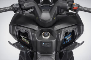 - Suspensão: Suspensão dianteira tipo double wishbone, comum em megascooters pesadas, que melhora a rigidez nas curvas e aumenta a estabilidade.