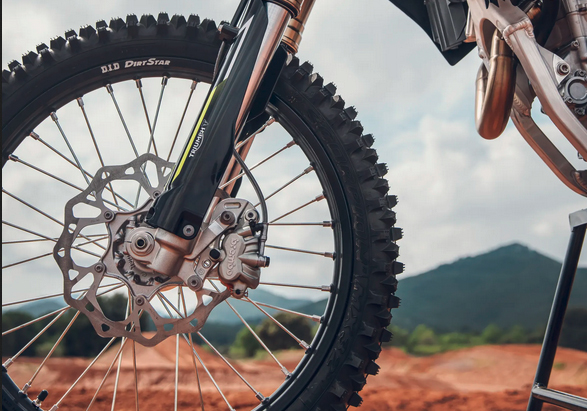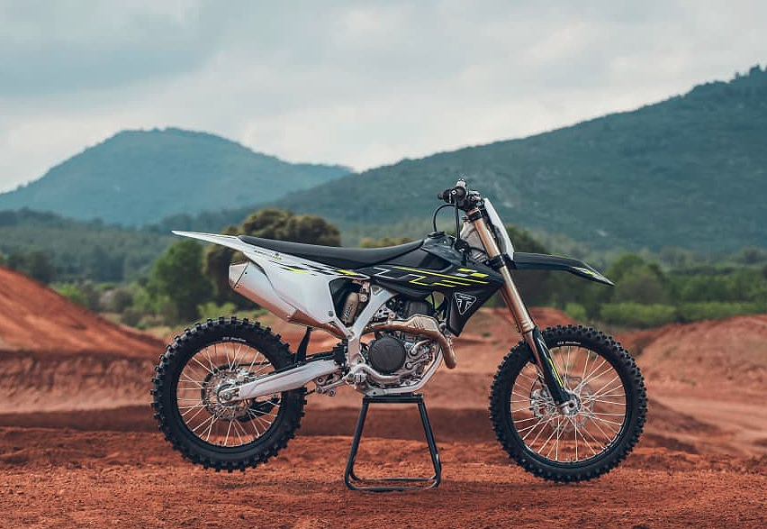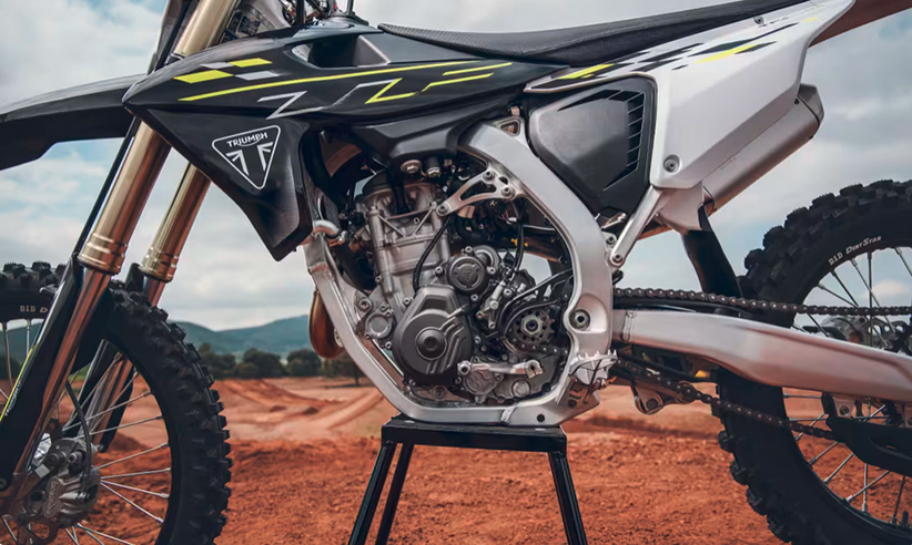 A TF 450-X mantém o quadro em alumínio da Triumph — um design ultraleve de berço duplo que equilibra os dois extremos de rigidez e flexibilidade para uma condução segura; garfos KYB AOS de 48 mm com mola helicoidal, amortecedor piggyback com ajuste triplo e um sistema de travagem com pinças Brembo e discos Galfer são outras das especificações.