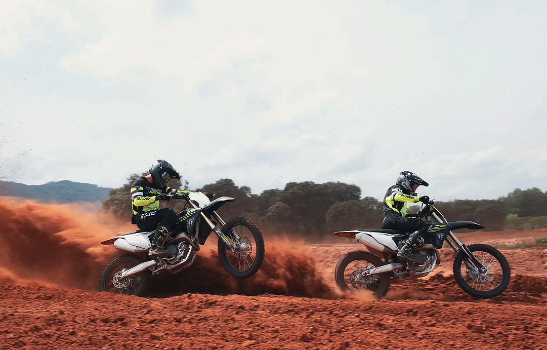 A TF 450-X mantém o quadro em alumínio da Triumph — um design ultraleve de berço duplo que equilibra os dois extremos de rigidez e flexibilidade para uma condução segura; garfos KYB AOS de 48 mm com mola helicoidal, amortecedor piggyback com ajuste triplo e um sistema de travagem com pinças Brembo e discos Galfer são outras das especificações.