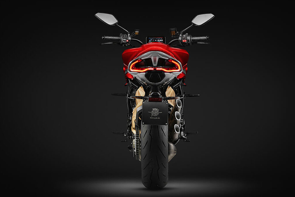 A transferência de carga otimizada do pneu traseiro garante uma resposta estável e comunicativa em acelerações fortes. As jantes forjadas leves reduzem a massa não suspensa para mudanças de direção ainda mais rápidas, enquanto o escape Termignoni slip-on em titânio, desenvolvido exclusivamente para a MV Agusta, melhora o desempenho.