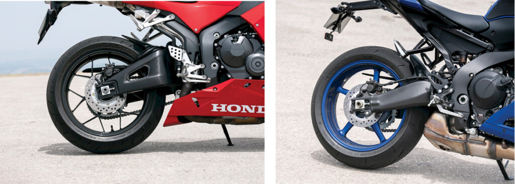 Toda a eletrónica da CBR 600 RR é inspirada na potente Fireblade, onde a unidade medidora de inércia ganha protagonismo para controlar as ajudas electrónicas e os humores da máquina. Este “restyling” de uma moto tão importante para a marca revigorou uma arquitetura que se pode definir como clássica e intemporal. A posição de condução é bastante neutra para uma desportiva, privilegiando o controlo sem negar algum conforto. Dentro do espectro de rivais que se apresentaram neste comparativo, a condução da Honda revelou-se sempre mais trabalhosa, mas não obstante, também a mais previsível.