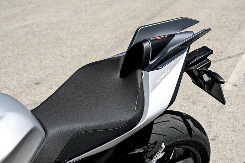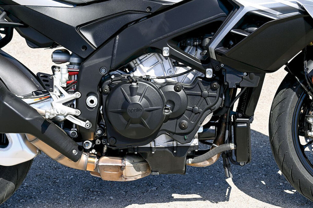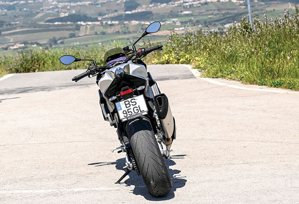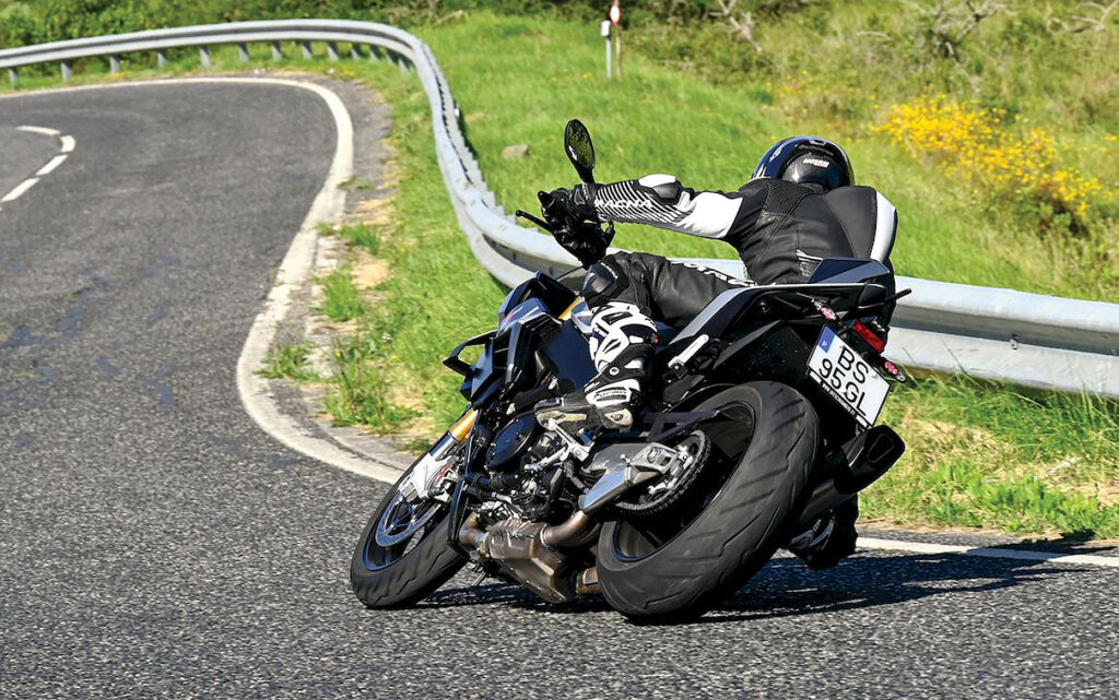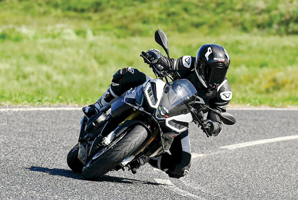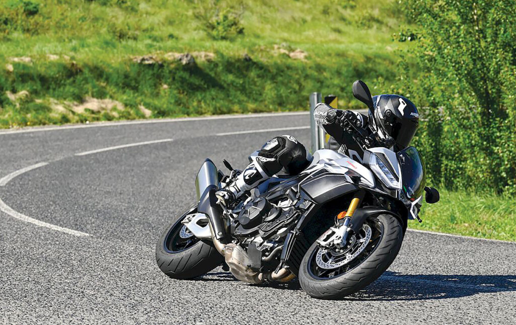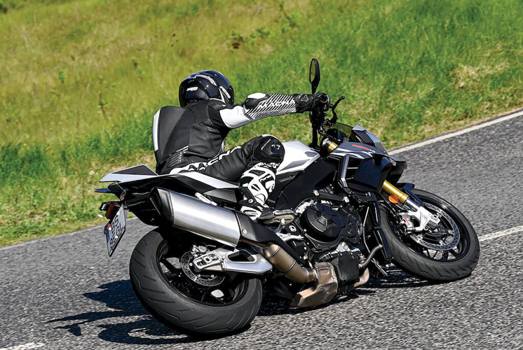 Há um certo aconchego emocional quando pegamos na Tuono V4 e rolamos os primeiros metros. A posição de condução é convidativa e pouco agressiva, estamos focados no eixo dianteiro, mas conseguimos poupar os pulsos e as costas. O V4 (tetracilíndrico em V a 75º com 1099 cc, debitando 180 cv às 11800 rpm e 121 Nm às 9650 rpm) já foi mais suave nos baixos regimes, mas este é o preço a pagar pelas normas restritivas. Esta moto vive facilmente da entrega de binário, e o seu carácter elástico faz dela um verdadeiro monstro da “condução despachada”.