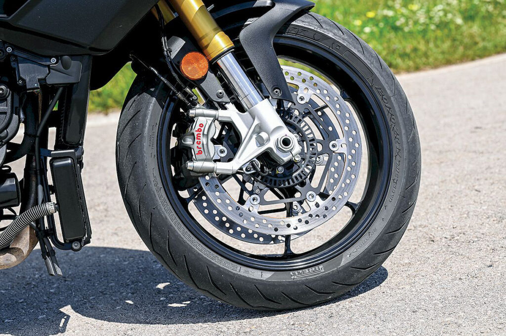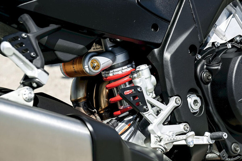 As suspensões da Sachs não têm o brilho das Öhlins semi-automáticas da versão Factory. Mas recorrendo a uma convencional chave de fendas podemos fazer ajustes capazes de mudar a personalidade de modo bastante notório. A Tuono consegue ter um pisar quase luxuoso, sem deixar de ser desportivo. Os ressaltos mais agressivos não lhe perturbam as trajetórias, assim como que nos garante um conforto de rolamento bastante aceitável. E assim conseguimos rolar rápido sem pormos o V4 a gritar, sem as bancadas gritarem o nosso nome e as miúdas desmaiarem à nossa passagem.