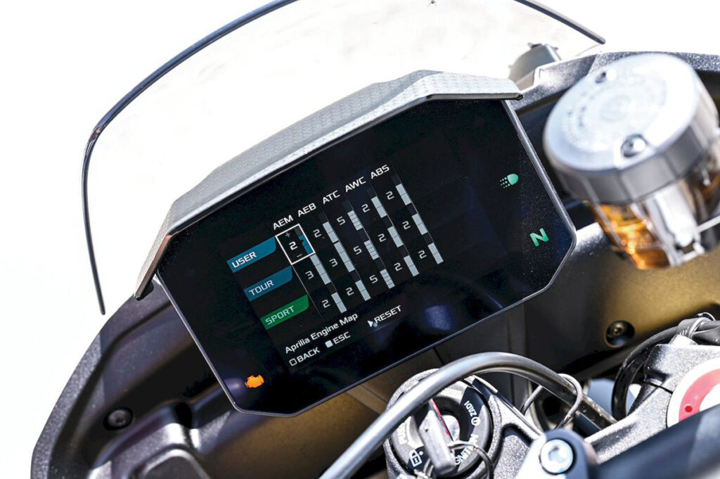 De facto, a lista é demasiado longa para ser resumida… O que a marca italiana denomina de APRC (Aprilia Performance Ride Control) não é mais do que o conjunto das tradicionais ajudas (Controlo de tração, anti-cavalinho, travão motriz e quick-shifter) sob o controlo de uma IMU, assim como os três mapas de motor customizáveis (User, Tour e Sport) e o ABS sensível à inclinação. E este é o pack Standard, que encontramos tanto na versão base como na versão Factory. Depois temos o Comfort Pack, o Track Pack, o Race Pack e ainda o Suspension Pack… Se o primeiro desbloqueia o cruise control e acrescenta umas úteis cornering lights, os três últimos transformam esta Tuono numa arma de circuito, muito próxima da sua génese, a RSV4.