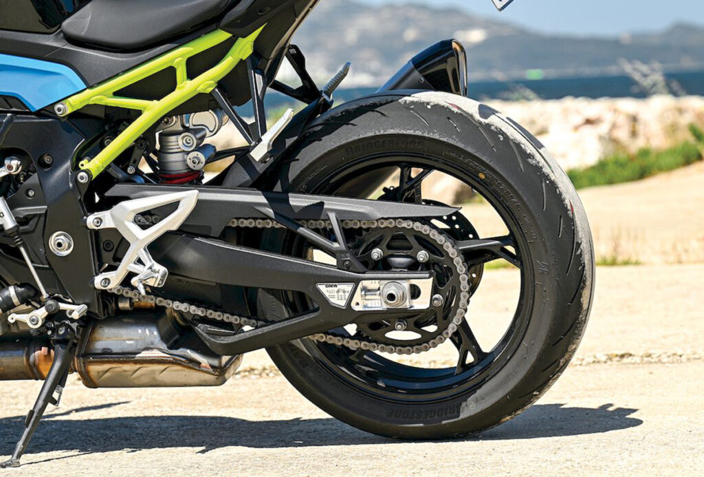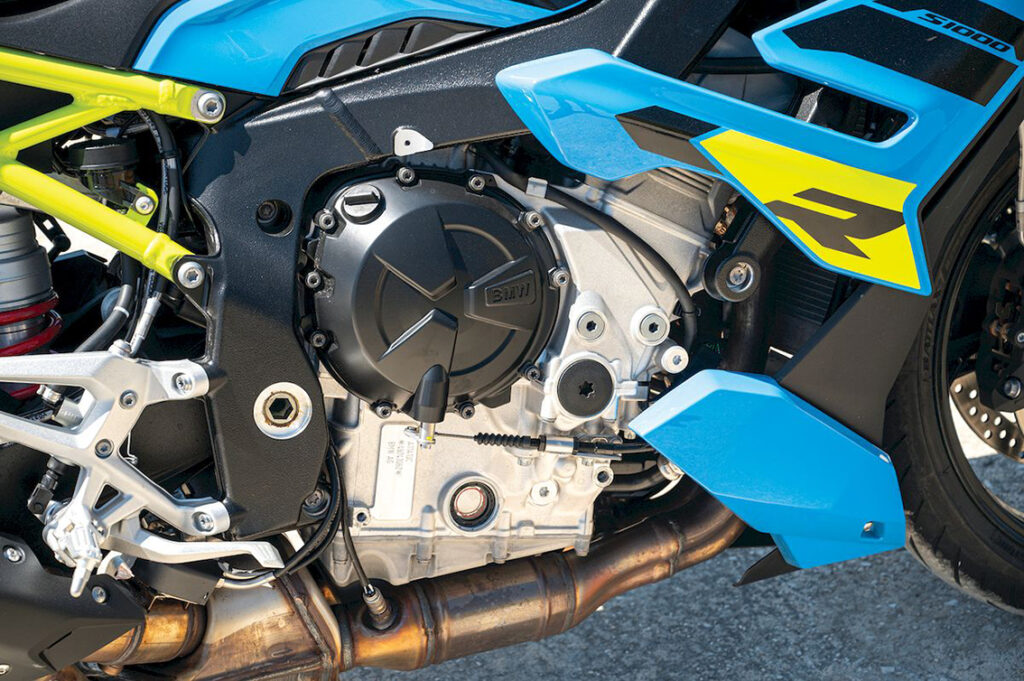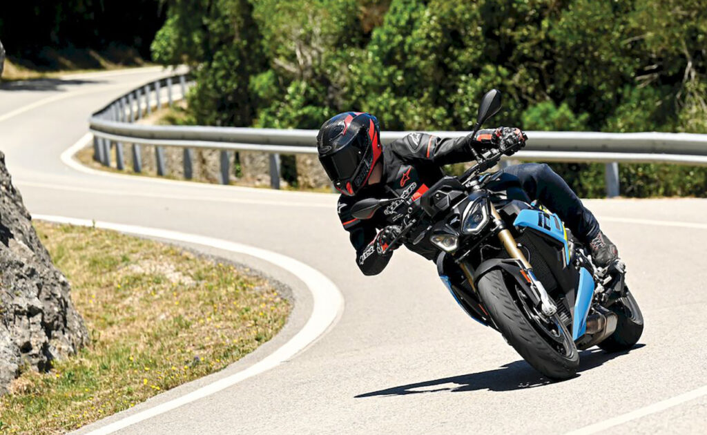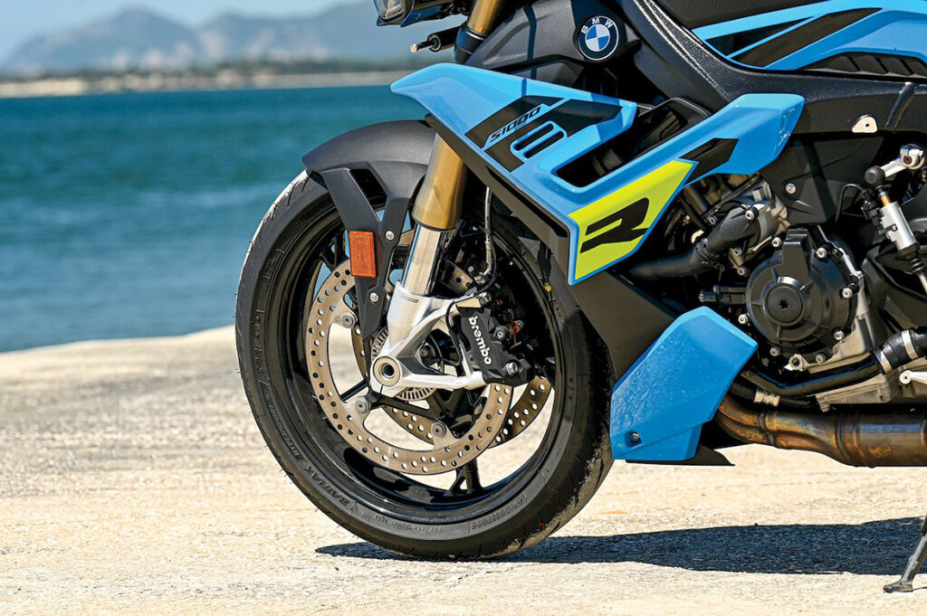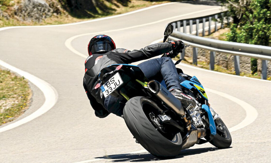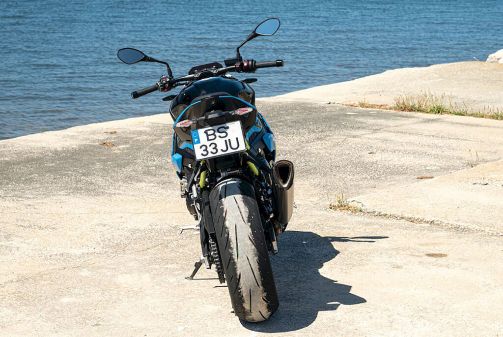 O coração desta moto é herdado da S1000RR, um motor de quatro cilindros em linha, que conta nesta naked com 170 cv (mais 5 do que na geração passada) e um trabalhar bem característico. O som deste bloco, e o próprio comportamento, é um pouco mais rude do que habitualmente encontramos num tetracilíndrico, principalmente a frio. O trabalhar muito próprio deste motor germânico também se traduz para as sensações de condução, com um comportamento mais áspero em baixas rotações, que vai suavizando à medida que nos aproximamos do limite de corte do motor. A relação de caixa mais curta nesta versão de 2025, juntamente com o acelerador rápido M, também ajudam a que esta S1000 R nos obrigue a agarrar forte o guiador quando rodamos totalmente o punho direito. A rapidez a que chegamos a velocidades proibitivas é enorme, e exige cuidado para que a carta de condução se mantenha com pontos. Apesar disso, a S1000 R é amigável no dia a dia, e os mapas de motor bem calibrados permitem gerir muito bem toda a potência disponibilizada, e deixa-nos ser suaves se assim o pretendermos.