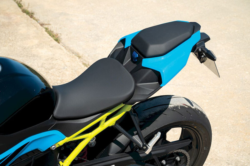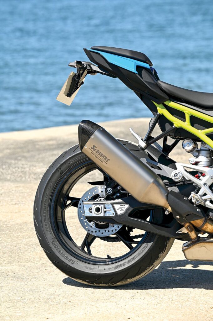 Ciclísticamente a BMW não se poupou a nada nesta naked. A versão base da S1000 R equipa suspensões totalmente ajustáveis à frente e atrás, mas a moto que testámos estava munida de umas Marzocchi eletrónicas, devido ao pack Dynamic que adiciona também Quickshifter e os modos de condução Pro. As suspensões eletrónicas funcionam bem, principalmente a velocidades mais elevadas, sendo menos amigáveis a baixas velocidades devido à sua firmeza. Firmeza essa que é reforçada pelo mesmo quadro que é utilizado na RR. O conjunto oferece assim uma boa estabilidade em curva e uma excelente leitura do asfalto – apesar da sua rigidez – uma vez que o sistema semi-ativo das suspensões funciona bastante bem. Os Bridgestone S22 oferecem confiança extra, na entrada e saída das curvas, e estão muito bem integrados nesta S1000 R. Ergonomicamente, esta moto tem um pendor claramente desportivo, com uma posição de condução mais focada na dianteira, o que nos faz perder um pouco o conforto que poderíamos ter com um guiador mais elevado, por exemplo. O assento também não é propriamente suave, o que nos prejudica em voltas um pouco mais longas, ainda que as pausas constantes sejam quase obrigatórias, devido ao depósito de combustível de 16,5 L, que se esgota com alguma facilidade se não formos cuidadosos com o punho direito.