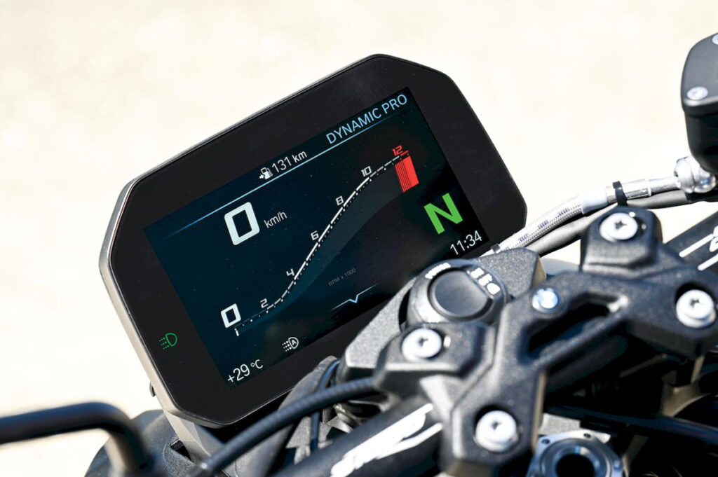 No que diz respeito à eletrónica, a S1000 R de 2025 vem equipada com grande parte dos sistemas que encontrávamos na geração passada da M1000 R, oferecendo assim grandes benefícios. O acelerador rápido M que já falámos é um dos aspetos herdados, assim como o controlo anti cavalinho e o sistema de controlo de derrapagem em travagem. Todos os sistemas funcionam bastante bem e são uma ajuda essencial para mantermos as duas rodas no chão. Em aceleração, o controlo de tração em conjunto com o sistema anti cavalinho, tornam a progressão da S1000 R possível de forma suave. A travar, o ABS pouco intrusivo e o novo sistema de controlo da derrapagem formam um par perfeito – mesmo quando utilizamos a travagem muito potente de forma afinca.
