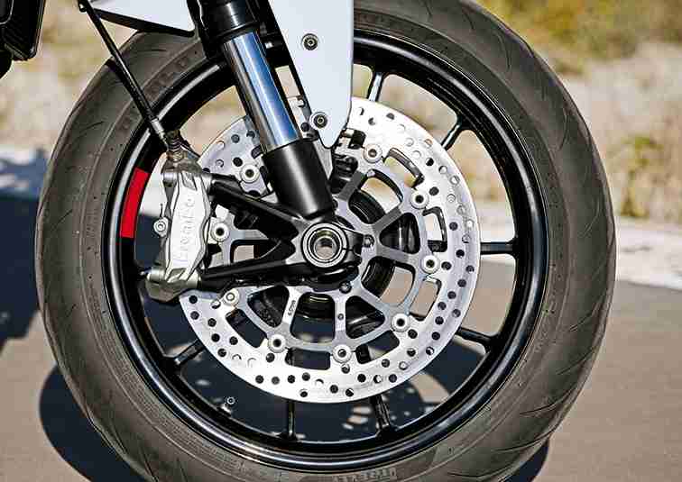 A travagem é mais que suficiente, com bom tacto e potente (temos a possibilidade de desligar o ABS na roda traseira, permitindo bloquear em travagem, se formos fãs do estilo supermotard).