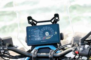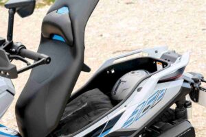 A Zontes (e as marcas chinesas no geral) habituaram os seus clientes a equipar de série as suas motos com muita tecnologia e apetrechos que muitas vezes são vistos como extras para outras marcas. Esta 368G não é excessão. Contamos com um painel TFT de 8” com diferentes mostradores e muita informação, câmara traseira e frontal, sistema Keyless, sensor de pressão de pneus, punhos aquecidos, comandos retro iluminados e possibilidade de espelhar o telemóvel no painel. A Zontes oferece ainda, de série, “crash bars”, luzes auxiliares – que adicionam uma excelente iluminação em condução noturna – iluminação totalmente em LED e protetores de mãos. O vidro é ajustável em cinco posições, mas de forma manual, algo que estranhámos, tendo em conta que outros modelos da marca (quase todos no segmento das scooter) possuem um vidro ajustável eletronicamente. Para além de tudo isto, a 368G conta com um espaço de arrumação bastante generoso – sendo possível colocar dois capacetes integrais debaixo do assento – e ainda um porta luvas com tomada USB onde caberão a maioria dos smartphones do mercado. Talvez um ponto que possa parecer irrelevante para muitos, mas que pode contar muito para outros, é a patilha que nos permite ter um travão de “parque” nesta Zontes. Basta pressionar a manete do lado esquerdo e puxar a pequena patilha que nela está integrada, e temos a certeza que esta scooter não nos vai escapar do descanso lateral quando estacionamos em declives. Por fim, no departamento “comercial”, o depósito de 17,5 litros é também um forte argumento de venda, principalmente tendo em conta os baixos consumos que conseguimos nesta scooter, a rondar os 3,6L/100 km.
