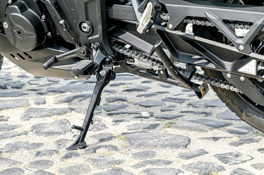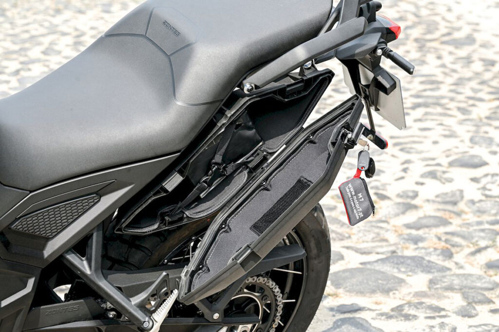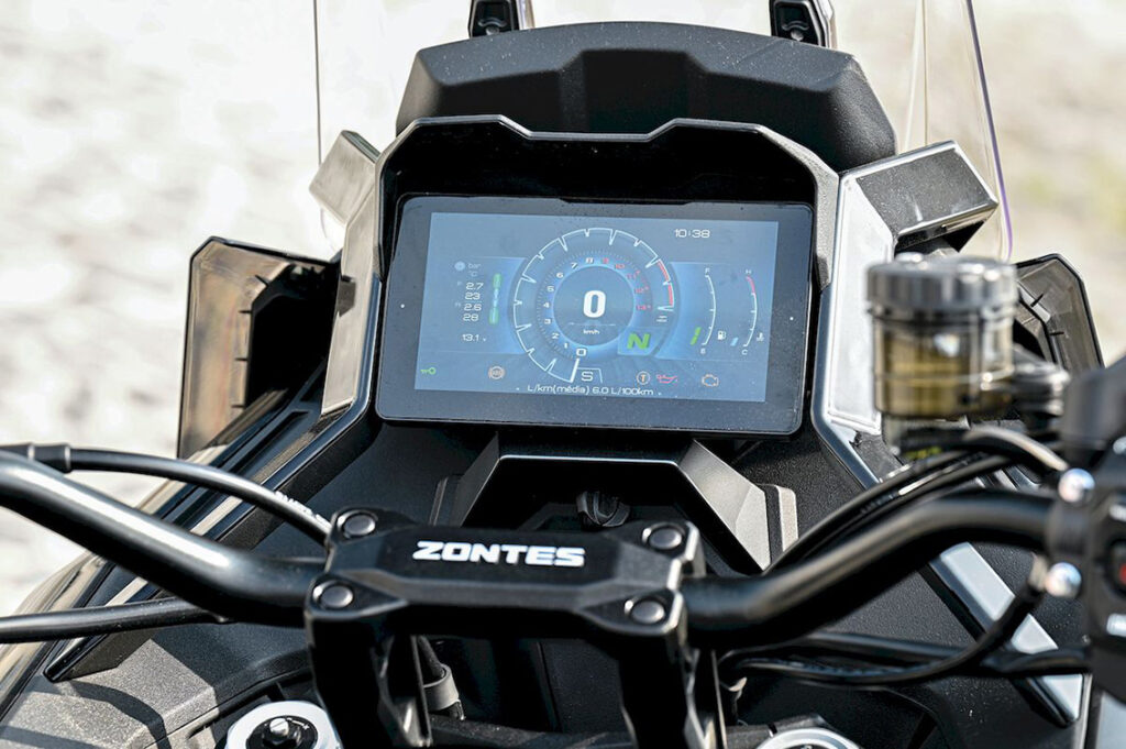 No que diz respeito a equipamento, mantém-se dentro do que já nos habituou, que é como quem diz, muito completa e competente. O painel de instrumentos é um amplo TFT de 5”, com cinco modos de visualização, conectividade com os smartphones e efeito espelho, câmaras HD na frente e atrás, punhos aquecidos, para-brisas elétrico, proteções de mãos com piscas integrados, chave inteligente, bateria de lítio e sistema de monitorização da pressão dos pneus (TPMS). É verdade, tudo isto é equipamento de série! Se o que gostas mesmo é viajar, a Zontes 703F também pode ser a solução, já que está equipada com um depósito de combustível com 22 litros de capacidade e para os mais poupados, pegando no exemplo dos 5 litros de consumo por cada 100 km, significa que podemos ter uma autonomia que ronda os 440 km. No entanto, com o entusiasmos facilmente fazemos cair essa autonomia… tudo depende da nossa relação com o punho direito. Por falar em viajar, aproveitando o lançamento da nova 703F, a Zontes oferece a possibilidade de comprarmos um kit completo de acessórios composto por crash bar, faróis auxiliares, mala traseira de 45 lt e malas laterais de 35 lt por apenas 1250€. Com este kit e o para-brisas de ajuste eletrónico ficas preparado para dar uma volta ao mundo…