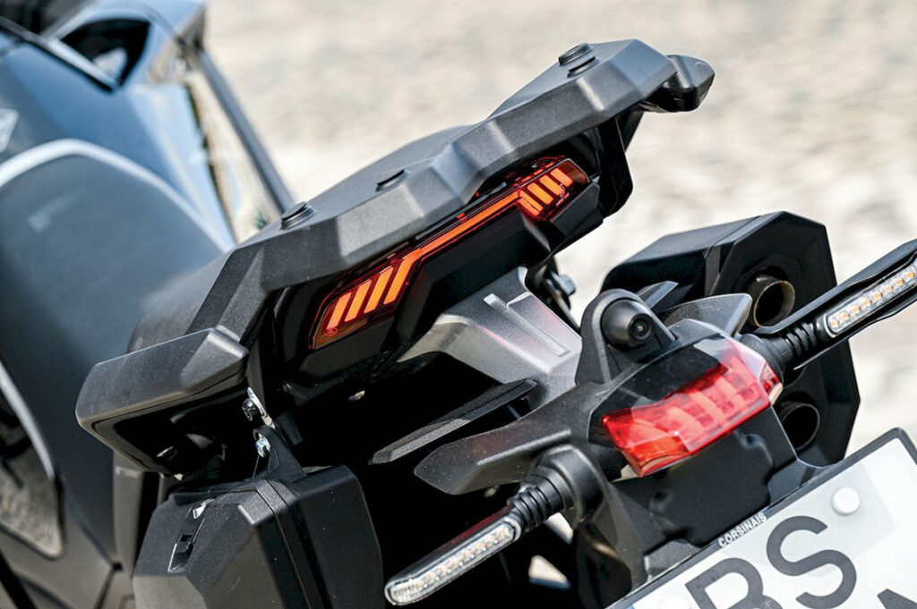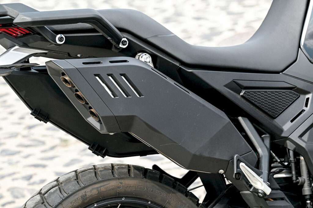 Esta Zontes 703F faz uma estreia em grande estilo no nosso mercado e vem melhorada face às versões “protótipo” e de pré-produção que fomos acompanhando. Uma dessas melhorias é ao nível do silenciador, que embora mantenha as dimensões generosas, conta com uma proteção que refina os acabamentos e a aproveitar o espaço na parte traseira, no lado esquerdo, temos um compartimento para pequenos objectos e ferramentas, com tranca, que se mostra muito prático. Muito equilibrada em termos estéticos, de ciclística, tecnologia e motor, há alguns aspectos que podem, no entanto, ser melhorados numa próxima atualização. A caixa com quick shift de série apresenta um funcionamento brusco e algo “duro” com um tacto não muito suave e apenas para passar de caixa, obrigando-nos a recorrer à embraiagem nas reduções. O motor, que é muito enérgico, brinda-nos com uma entrega de potência que peca pela falta de suavidade, mas como em tudo na vida, é uma questão de habituação e é também uma questão de ajuste da injeção que numa próxima atualização deverá ser tido em conta. A frente da Zontes 703F sente-se um pouco solta e vaga e o travão dianteiro apresenta um início de curso desprovido de qualquer ação, sendo necessário apertar mais a manete direita para depois sentirmos a mesma a atuar. O centro de gravidade é um pouco alto, que torna pouco lesta a nova trail asiática. No entanto e em jeito de balanço, a nova 703F é uma opção com a qual as rivais pouco podem competir, dados os fortes argumentos que apresenta, atendendo aos 8000€ que custa. Esta é uma opção que vai colocar muitos a pensar “olha, e porque não?”