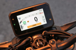 À semelhança da potência, este pode ser um tema sensível, ou que afasta alguns compradores da CB1000 Hornet. Contrariamente a modelos com a Africa Twin, CBR1000 RR-R ou mesmo a CBR600 RR, a Honda optou por uma eletrónica mais simples nesta nova naked. Mau? Talvez não. Não deixamos de ter controlo de tração, ABS, modos de motor (3 pré-definidos e 2 personalizáveis), travão de motor regulável, controlo anti cavalinho e QuickShifter de série (na versão SP). Tudo isto, controlável através do painel TFT de 5”, com uma apresentação bastante simples e intuitiva de ser lida. Simples está também a navegação neste mesmo painel.