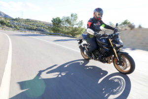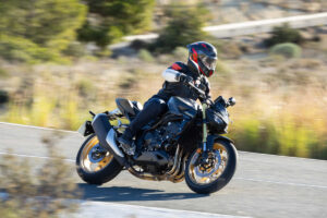 O motor, apesar de baseado no bloco original de 2017, foi altamente revisto e alterado em vários componentes, não só para passar nas restritas normas EURO5+, como também para ter um carácter mais adequado a uma moto do segmento que agora integra. A relação de caixa foi revista, de forma a proporcionar uma melhor resposta em médios e baixos regimes, os pistões são novos e a eletrónica e mapas de motor são também novidade. Tudo isto, permite ter uma resposta mais pronta deste tetracilíndrico. Não deixa de ser um motor de quatro cilindros em linha, o que significa que a sua área ótima de utilização é acima das 6.500 rpm, mas antes disso temos disponibilidade suficiente para não termos de nos preocupar em passar de caixa se queremos uma boa resposta de acelerador à saída de curva. A facilidade de condução é abismal, mesmo com os quase 160 cv. É possível e fácil de rodar o punho direito no seu curso total e mesmo assim sentir que estamos no controlo total do que está a acontecer, sem que o painel de instrumentos pareça uma árvore de Natal, com todas as ajudas eletrónicas a entrarem em ação ao mesmo tempo. Isto pode também entregar uma falsa sensação de que estamos a andar devagar, mas é isso mesmo, é falso, porque esta moto é muito rápida.