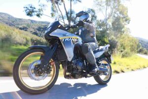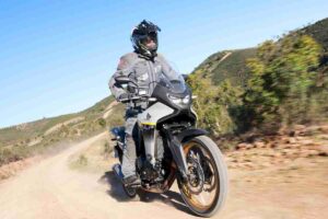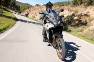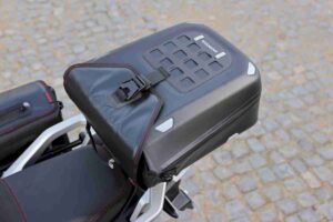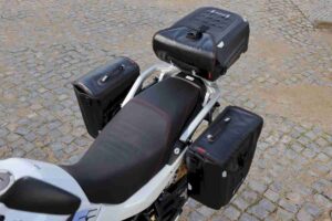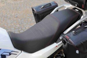 Novas são as malas laterais semirrígidas e impermeáveis, com 16 L. de capacidade, sendo que a do lado esquerdo pode ser utilizada como espécie de ‘top case’. Importante mais-valia, muito agradecido ao longo de todo o dia de ensaio, é o banco mais confortável. Tem espessura de enchimento aumentado em 15 mm e pode juntar-se ao redesenhada para-brisas mais alto, ou os faróis de nevoeiro.