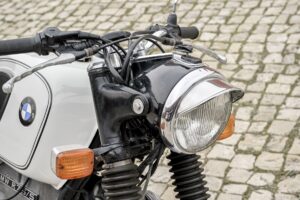 Em rigor, as primeiras alterações dignas de monta só surgiram com a adoção da injeção. A BMW Série 5 era de construção modular. Um verdadeiro “três em um”, sendo que as três motos eram basicamente iguais, tirando alguns autocolantes e o motor que se declinava no modelo de entrada, o R50/5, de 498 cc, o intermédio R60/5 de 599 cc e o topo da pirâmide R75/5, com 745 cc com uns respeitáveis 50 cv e um elevado binário de 60 Nm. O branco tem muito encanto Apesar da tradicional sobriedade da marca alemã, não há como negar que este branco tem um charme único e nos conquista ao primeiro olhar, mais ainda com as malas Krauser, de 20 litros cada, originais da época, reforçando a capacidade de viajante incansável desta moto e este motor de maior cilindrada.