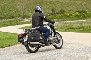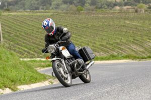 Esta R75/5 é uma moto encantadora e independentemente do ângulo de visão consegue conquistar nos. Uma moto bem-nascida e muito apreciada também pelas forças de segurança, sendo que equipou as forças policiais de muitos países, tal a sua robustez e simplicidade. Impressões de condução Como não podia deixar de ser, um teste desta natureza só podia ficar completo com alguns quilómetros ao guiador (perigosamente estreito) para melhor desfrutar das suas potencialidades e perceber as suas limitações. O ritual de arranque é simples com o motor a frio, mas obedece a uma ordem: abrir as duas torneiras de gasolina para que os carburadores Bing possam alimentar os cilindros, “enriquecer a mistura ar/gasolina”, ignição ligada e só depois dar uso ao motor de arranque ou, em alternativa, ao pedal que fica em posição transversal e obriga a algum exercício. Quando o motor atinge alguma temperatura podemos “empobrecer a mistura” e fazer-nos à estrada, sendo que o motor, ao ralenti, tem aquela tradicional vibração, mas que desaparece assim que arrancamos e percebemos como esta moto é especial.