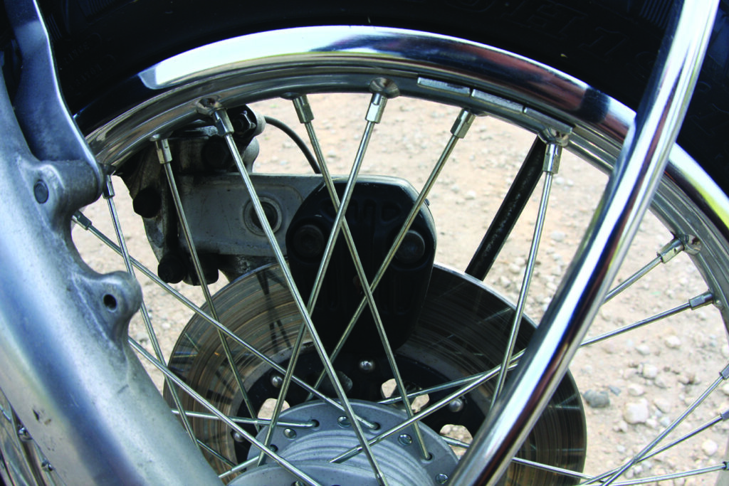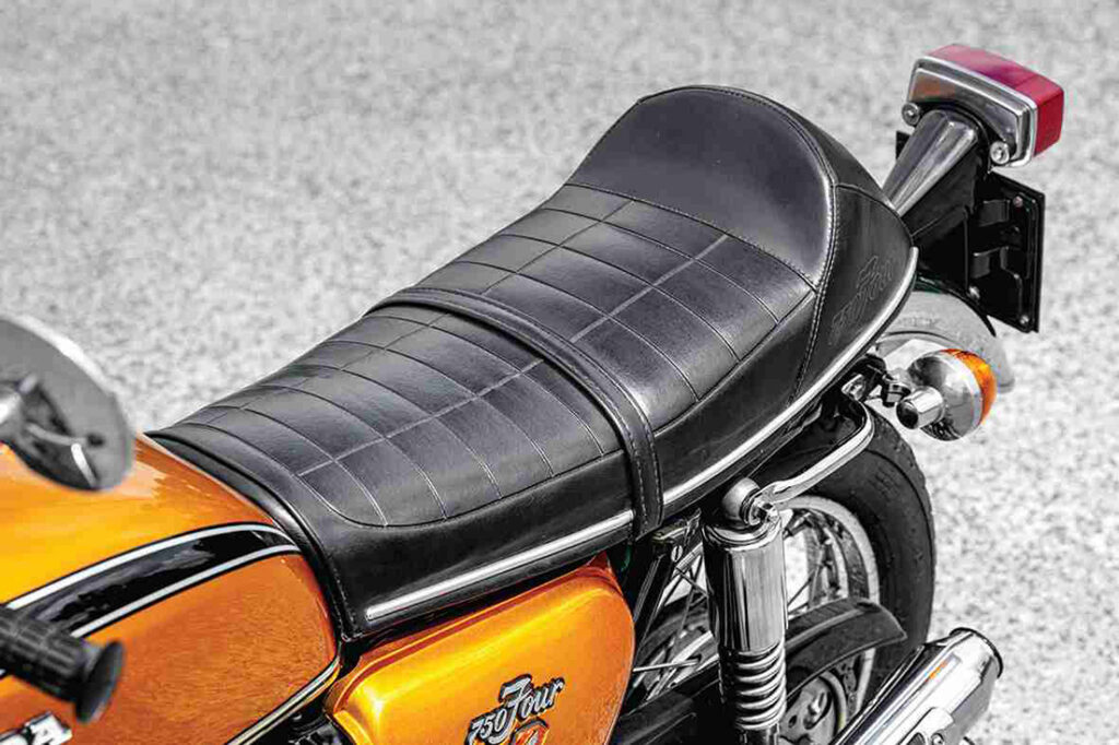 Este exemplar já foi alvo de restauro há uns anos (a pintura parece nova) e está num estado excelente, embora seja facilmente percetível que o assento não é original. Aliás, nos anos da comercialização e seguintes era prática comum fazer alterações: guiador diferente, outro assento, fazer dos escapes “quatro em um”, amortecedores melhores… eram apenas alguns exemplos.