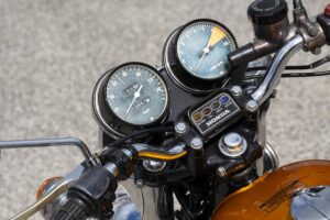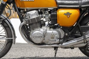 Conduzir uma CB 750 Four não é uma aula de arqueologia prática, mas é fulcral que tenhamos a humildade de nos focalizar no contexto de um projeto que começou a ser delineado nos meados da década de ’60. Se tivermos essa consciência percebemos que a moto, face aos padrões atuais é quase um fóssil motociclístico, mas na época era o clímax e se em 1969 a Missão Apollo 11 chegou à lua e mudou a visão do espaço, também a CB 750 mudou a realidade do motociclismo global nesse ano. A chave de ignição ainda está posicionada na lateral esquerda e o resto é o habitual: abrir torneira de gasolina, enriquecer a mistura (choke) se o motor estiver frio e usar o motor de arranque ou o pedal (kick starter), fica ao critério de cada um.