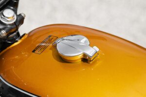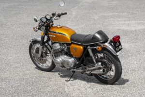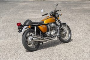 Este exemplar já foi alvo de restauro há uns anos (a pintura parece nova) e está num estado excelente, embora seja facilmente percetível que o assento não é original. Aliás, nos anos da comercialização e seguintes era prática comum fazer alterações: guiador diferente, outro assento, fazer dos escapes “quatro em um”, amortecedores melhores… eram apenas alguns exemplos.
