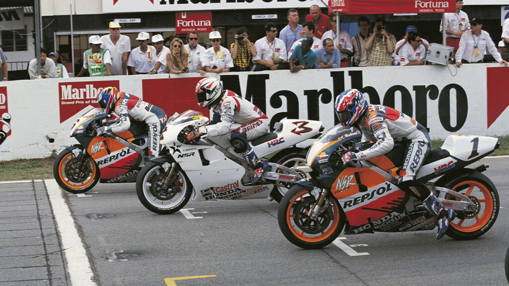 A resposta avassaladora dos motores 2 tempos de 500, com potências superiores a 200 cv e pesos em torno de 130 kg, viu o seu caráter parcialmente contido na década de 1990 graças a soluções como o “big bang” da Honda (que combinava as explosões dos quatro cilindros em pares para reduzir a tensão no pneu traseiro), a chegada da injeção eletrónica ou da gasolina sem chumbo.