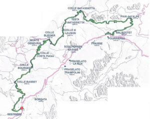 Construída entre o final do século XIX e o início da década de 1930 como uma estrada militar para ligar os fortes ao longo da serra entre Val di Susa e Val Chisone, a SP 173 dell’Assietta é um verdadeiro museu a céu aberto: 34 km quase inteiramente acima de 2.000 metros, passa em lugares como Colle delle Finestre (2.176 m), Colle Blegier (2.381 m), Colle Costa Piana (2.313 m), Colle Bourget (2.299 m), Col Basset (2.424 m) até Colle dell’Assietta (2.472 m). Hoje preserva trincheiras, ruínas de fortalezas e panoramas infinitos. Trincheiras e ruínas de fortes militares (Fort di Fenestrelle, Fort di Chaberton). Vistas deslumbrantes da cordilheira de Monviso e do Vale de Susa; são 34 km de estrada de terra batida, mas com trechos acidentados: recomendamos o uso de motos do tipo ‘dual sport’ ou adventure.