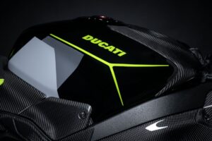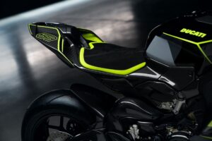 A Panigale V4 Lamborghini torna-se particularmente única pela decoração baseada na cor preta de fibra de carbono com textura visível, detalhes em Verde Scandal, Grigio Telesto e Grigio Acheso, e o banco dedicado, que se inspira no interior do Revuelto.