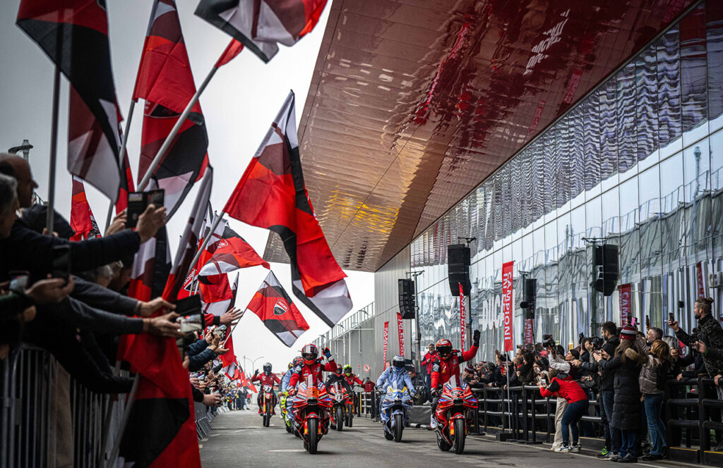 Foi com alguns destes pilotos que se realizou o momento mais aguardado do dia, o desfile com as respetivas motos oficiais de competição. Marc Márquez, Francesco Bagnaia, Álex Márquez, Fermín Aldeguer e Fabio Di Giannantonio, conduzindo as suas Desmosedici GP, Nicolò Bulega na Panigale V4R Superbike, Tony Cairoli e Jeremy Seewer na Desmo450 MX e Alessandro Lupino na Desmo250 MX, deram uma volta de honra na fábrica da Ducati por entre aplausos e entusiasmo, trazendo a emoção das pistas para dentro da empresa, que por breves momentos se transformou numa verdadeira festa.