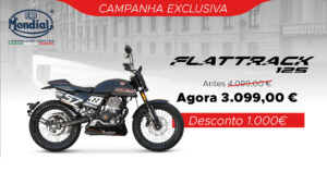Começamos por destacar a Flat Track 125, uma verdadeira moto de Speedway, pensada para quem gosta de marcar presença com uma atitude confiante. Com um desconto direto de 1.000€, está agora disponível por apenas 3.099€ (antes 4.099€).