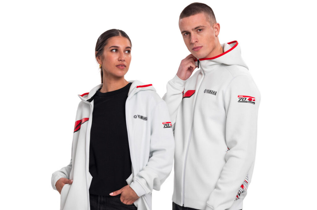 Elegante e confortável, a camisola unissexo 70º Aniversário é perfeita para o uso diário. O fecho de correr a todo o comprimento e o capuz com cordão oferecem conforto à medida das necessidades, com a marca exclusiva do aniversário que capta o espírito Yamaha. Use-a na pista ou por casa!